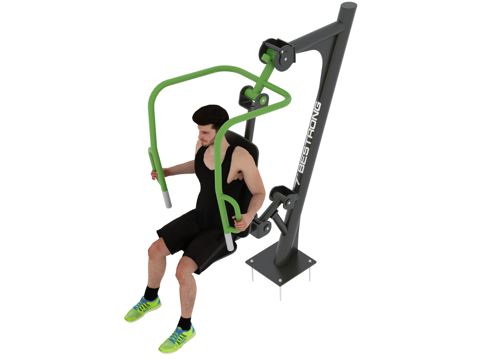 Il dispositivo è adatto per rafforzare i muscoli pettorali, braccia e spalle. La macchina per il torace è progettata per un allenamento complesso dei muscoli del torace attraverso esercizi di carico e spinta. Permette di esercitare i muscoli pettorali in modo dolce. Senza un carico dannoso sulle spalle o sui gomiti. Una forma alternativa alla panca piana. Le impugnature del dispositivo sono posizionate ergonomicamente a diverse altezze e angolazioni per garantire le massime prestazioni ed efficienza.